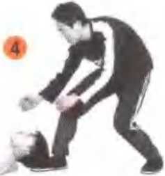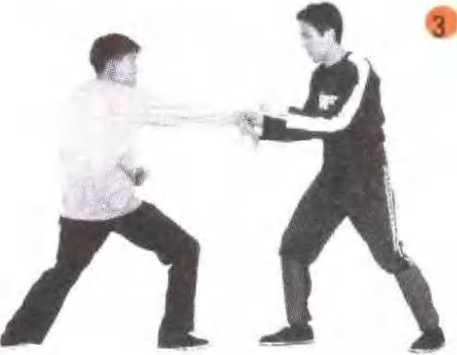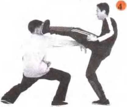 甲方抓住乙方掌指时,即可反折其手指,使其腕 臂受到屈折,上步发腿弹踢要迅速准确。