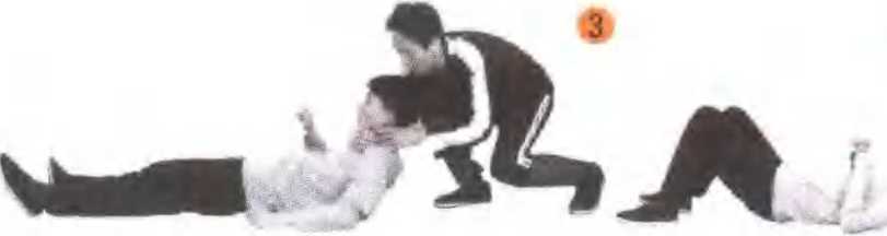 屮方与乙方对峙时,乙方迅速扑向甲方,甲方看准 乙方攻势,迅速闪身使乙方扑空,紧接绕至乙方身后 以两手抓住乙方两肩,擒扣住乙方,乙方用力稳定身 势时,屮方两手扣住贫?两肩不放,以左腿稳固身势猛 发出右腿脚前踢乙方腿膝,在乙方身体向后倾跌时, 甲方以两手变式扣住乙方颈部将其向后托摔倒地(图