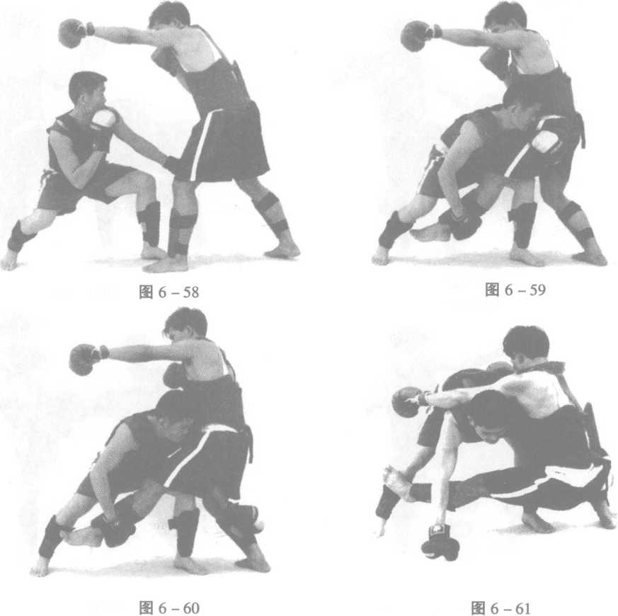 预备势开始,当对方用左冲拳攻我头部时,我速上步下潜,双手从胸前屈 肘,抱对方的左腿膝或大腿部。随即,右手由上向下绕抱移至小腿下端向内回 拉,左手掌心向右移至右腿膝关节后部,并向外按拉。左肩顶压对方的左大腿跟 部,向右下转肩,同时发力,对方即倒。如图6-58、59、60、61。要向右后甩头,目 视右后。