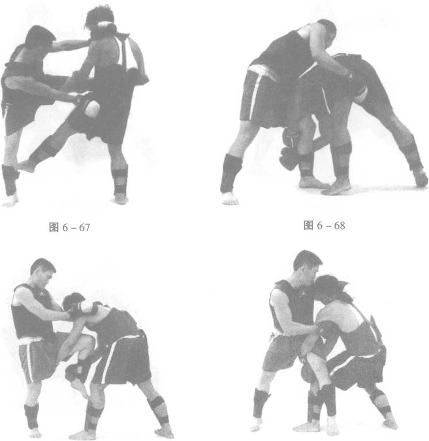 1 当对方抱住我左腿(右)腿,欲用手别时,我速将左(右)腿向对方的左腿 (右腿)外侧插别,并用左手(右手)按压对方的头部、用右手(左手)向左后(右 后)猛搬对方臀部,将对方摔倒。如图6-67、68。