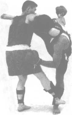 1 左手抄腿无力,主要是所抄部 位不对。纠正时要接近对方膝关节或大 腿部,夹抄要紧。