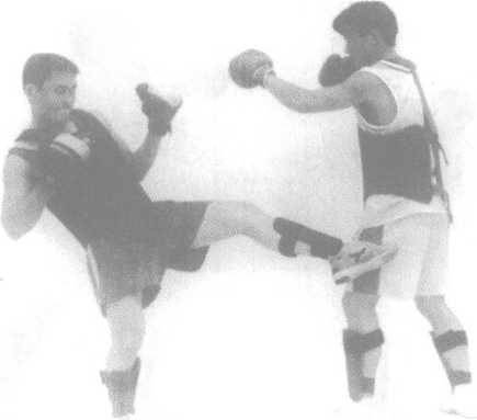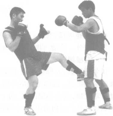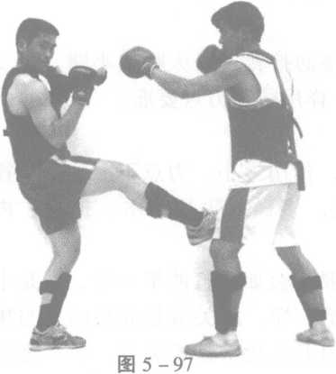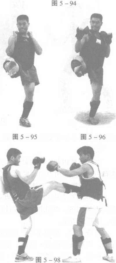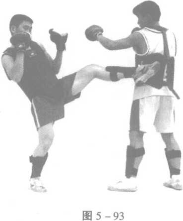 预备势开始,重心后移至右腿,同时,左腿屈膝上提。以膝关节为轴,绷脚以 脚背领先,向左前方用力弹踢,膝关节斜向左前方。在接触目标一刹间,绷脚,挺 膝,上体保持实战势。如图5-90、91。要点:起腿要快,弹击要猛,有暴发力。易犯错误及纠正方法:1 没有外翻脚背,发力不准,纠正时,多 体会反弹踢的动作要领。2 挺膝,髓外翻不协调,纠正时,多做击 打练习。实用范例:1 进攻对方的左腿外侧。如图5-92。2 进攻对方的臀部和肋部。如图5-93。3 结合垫步,反弹踢对方右大腿内侧。图 5 - 92如图5-94。