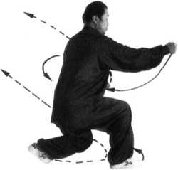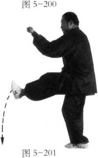 上述是一完整动作,应一气呵成;手脚齐到,劲来自丹田与腰;左脚外甩,要借右胯 “环跳穴”向左挤,腰抖转使左胯甩出,带动大腿,小腿及脚发劲;左右鹰捉之窍要同鹰捉。