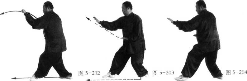 紧接上动,右脚以脚跟为轴向左后扣,腰随之左转, 右拳外拧贴肋按穴拉回至丹田右侧,拳心向上;同时,左 脚借左胯左甩之劲,蹭过右里踝骨后,向左后方摆扣、蹬 出,脚尖外展;随即左拳里拧贴肋按穴经“膻中穴”向左 脚方向钻出,拳心向上,拳高与眉齐(图5-201 );动作不 停,左脚向前向下踩落,脚尖外展45° (图5-202 );动作 不停,右脚向前趟进一步,左脚随即跟进半步,成三体桩 步形;右拳同时贴肋按穴沿左小臂向前、向上,接触左拳 后变掌向下翻落,成定步鹰捉右式;左拳边向里拧边贴肋 按穴变掌拉回至丹田左侧,掌心向下;目视右掌前方(图 5-203 );动作不停,右脚以脚跟为轴外展45。,左脚摆直