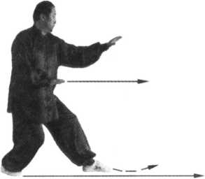 前稍上搓穿出去,虎口向前,掌尖向左;左掌在右小臂上向前稍上搓穿而出,虎口向前,