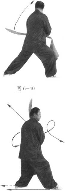 2. 不停,身体重心后移至左腿.右手持刀、左 手扶右腕向上搂挂刀,尖朝上、刃朝后;目视前方 (图6-41 )。