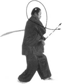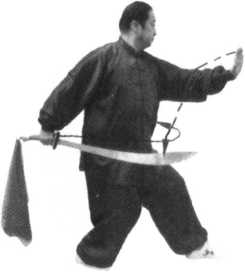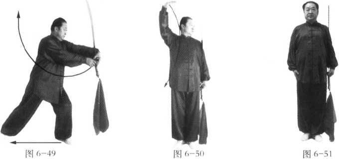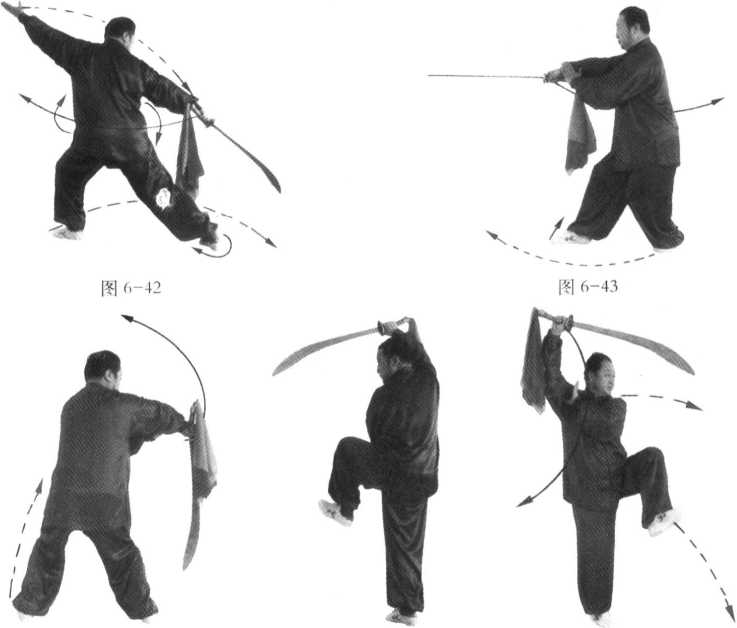 (五)“插步豪脑转身劈刀”继续按前半趟的动作及 窍要向回练。当再练至动作(十一)“退步转身独 立插刀”时,即可做收式动作。