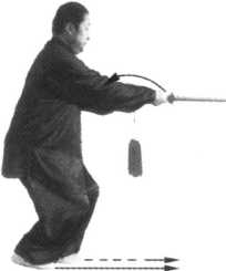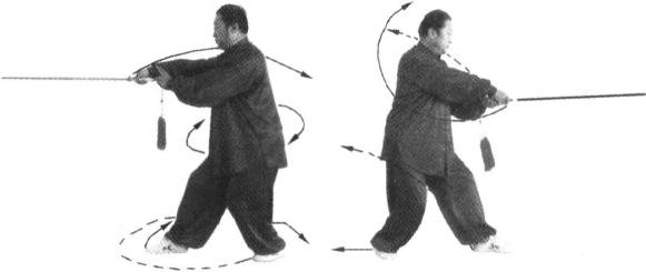 步,左脚随即趟进一步成三体桩步;同时,左手与右手搓把(左推右拉),将剑向里立挂,