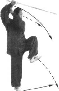 6. 不停,右脚边向外拧边后撤一步,左腿随之提 起,左脚尖微上翘,成右独立步;同时,右手持剑向 下、向后、向上、向前下方抽、抹、撩、扣、扎剑, 停于头上,尖朝前下方,刃朝上下;左剑诀在右手撩 剑过程中,向下、向左、向上划弧,当右手至头顶 时,回搂扶按右腕脉门;目视剑尖(图6-66)。