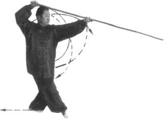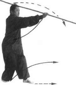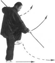 钻棍与左脚前趟踩落同时到位;钻棍要含有推、 锂、戳、钻之劲;棍之前端与左脚上下相对;此动 要与动作(十)连贯动作,一气呵成,左右翻飞、 进退一体,含胸拔背。