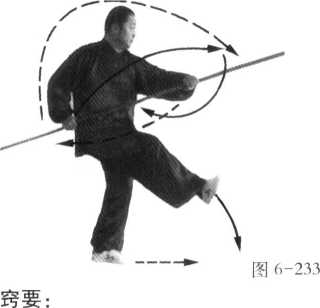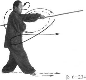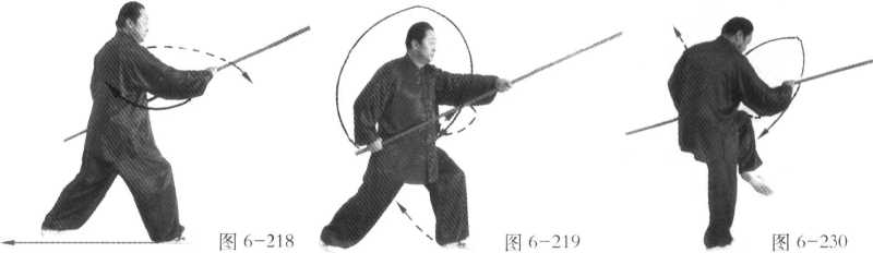 图 6-232图 6-232紧接上动,身体重心前移,左脚向前垫一步, 右脚屈膝向前蹬出;同时,右手捋棍向身右侧由下 向后挂拨,手贴靠于后;左把则借力由上向刖盖击 出,力贯棍端;目视棍前方(图6-233 );不停,右脚向前踩落,脚尖外展,左脚跟进半 步;同时,右手握把在身右侧向上、向下、向后拨带至左腋下;左手捋把由后向上、向 前劈出;棍高与胸齐,棍的指向与右脚的前进方向相同;目视棍前方(图6-234 )。