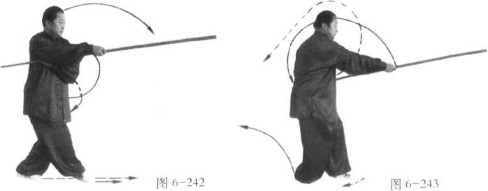 同时,右手捋把从后向前、向上拨棍,高与胸平;左手握棍同时由前向上,向头上左侧方拉 撑,以助右把拨棍之力;目视棍前端(图6-241儿