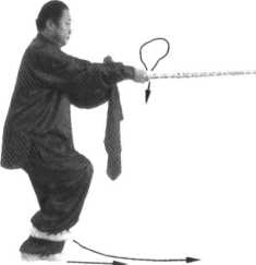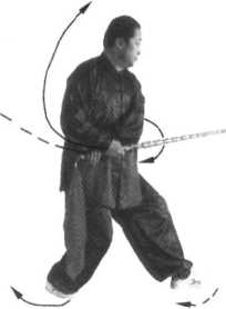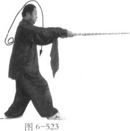 紧接上动,左脚尽 力向前踩落一大步,右 脚随即跟进提起,成右 提步(过渡性步型);同 时,左手向右推,右手 向右平拨,使鞭向右摆 出,左手随即按扶在右 肘前;鞭尖朝前,高与 肩平(图6-522 );不停, 右脚向前趟进--步.左 脚随之跟进半步,成三体桩步形;与此同时,左手抓握鞭把后半部.两手握鞭向外翻绞下 砸,鞭高与肩平,尖朝前佐手心向右、右手心向左;目视前方(图6-523 )。