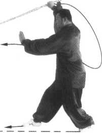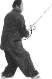 2. 不停,右脚后撤一 步;同时,右手握鞭边向外 拧边向下、向右、向上在身