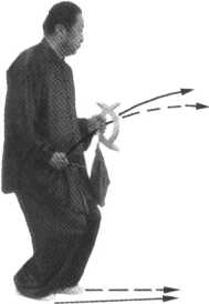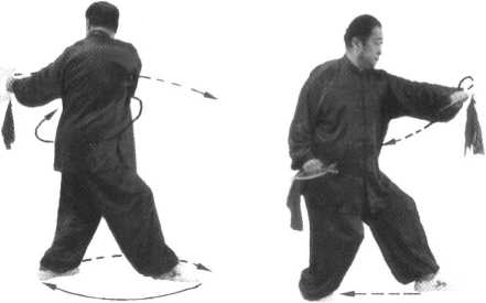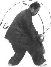 借上动崩钺之余力,右脚疾速落地踩实、蹬地,将 反作用力传递至胯、腰,催逼右钺铲出;左钺合右钺时, 需借铲右钺抖拧腰之劲而拨合;身虽微前倾,但不可哈 腰,沉肩束身。