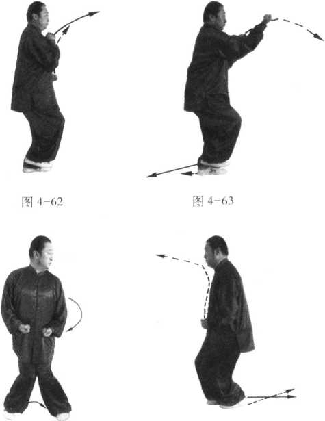 退步劈拳是右式与左式交替而练的,其动作窍要与右式相同,惟左右相反(图4- 62、63、64 )。