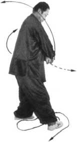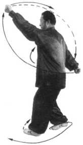抡臂时要走贴身立圆,与摆扣步、转身同时进行,协调随和;发出的劲力是丹田向 右抖转,腰向右抖拧并长腰,右 胯“环跳穴”向左顶,向右甩胯 带动大小腿而完成的,不可只用 小腿及脚的动作。