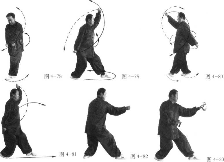 (3 )摇身劈拳。动作窍要与摇身劈拳左式相同,惟左右相反(图4-78、79、80、81、82 )。
