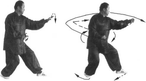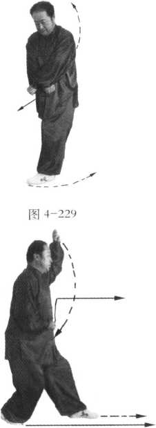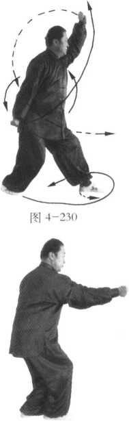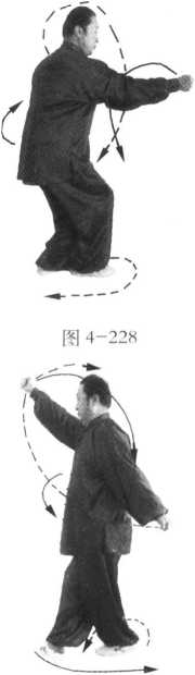 接左式,左脚(前脚)尖外展45。,右拳贴肋边向外拧转边贴身按穴沿左肘“曲泽 穴”、“内关穴”向前崩出;左拳边向外拧转边拉回丹田左侧,拳心向上;右脚同时向 前趟进一步,脚尖向前,左脚随即跟进半步,脚尖方向不变,成顺步崩拳(图4-228 ); 动作不停,左脚呈弧形趟、扫、扣在右脚前,练摇身崩拳右式,其动作窍要同摇身崩拳 左式,惟左右相反(图4-229、230、231、232、233)。3. 收式图 4-231 图 4-232 图 4-233练至左式时方可收式,其动作窍要同定步鹰捉左式,惟无两掌变拳动作。