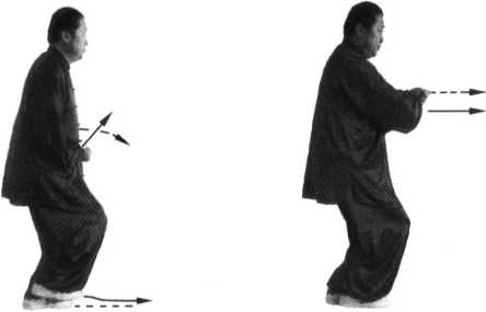 ② 上动不停,左脚用力后蹬, 右脚尽力向前趟出一大步踩实, 左脚用时跟进提起,停于右脚里