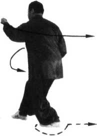 左脚要借向里压膝与抖拧 腰之力以扣步,扣步时要灵 活,并膝裹胯。