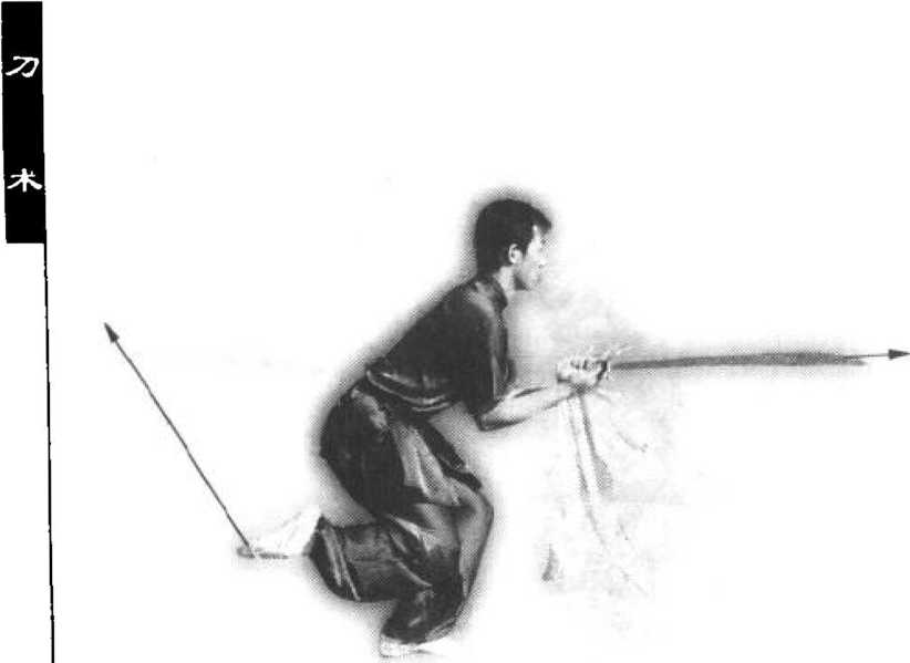 接上势,上身微前倾。右腿微屈,支撑 身体重心;左腿屈膝向后撩踢,脚底向上。 同时,右手持刀,两臂屈肘约90。相平行, 两臂距离与肩同宽,右手持刀和左掌同时内 旋分拨,刀刃向左,刀尖向前,刀与胸平; 左掌掌心向下。目视刀身(图35)。