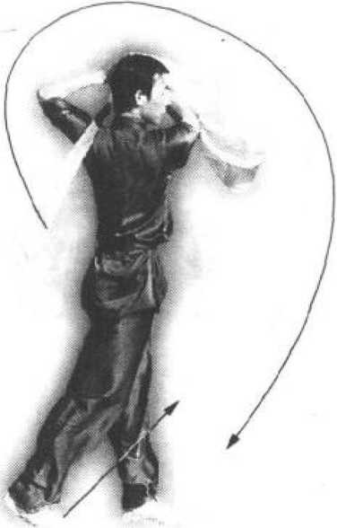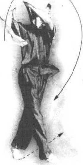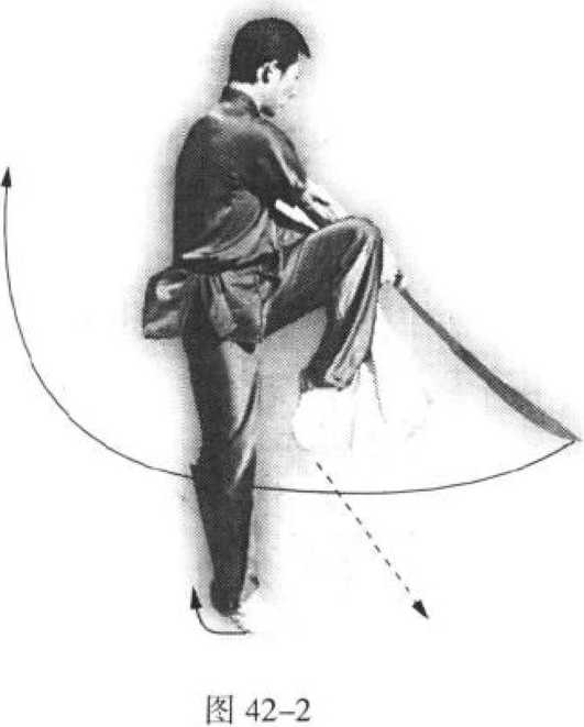 接上势S身体重心前移,身体向石拧转 90。。右脚尖外展,左脚跟离地。同时,双 手持刀,右臂内旋、左臂外旋,向前上方撩 拨,刀刃向上,刀尖向前上方。目视刀刃 (图 41)。要点:动作幅度不要过大,以腰带臂, 手腕柔和发力。图 42-1(1)接上势,重心上移。两手抱握刀 上举于头右上方,刀尖向:下,刀刃向危 (图 42-1)。作图解作图解作图解作图解(2 )上动不停,右腿直立支撑,左腿屈膝 提起。同时,两手握刀向下沿左腿外侧抡劈 (图 42-2 )0图 42-3