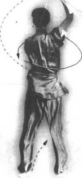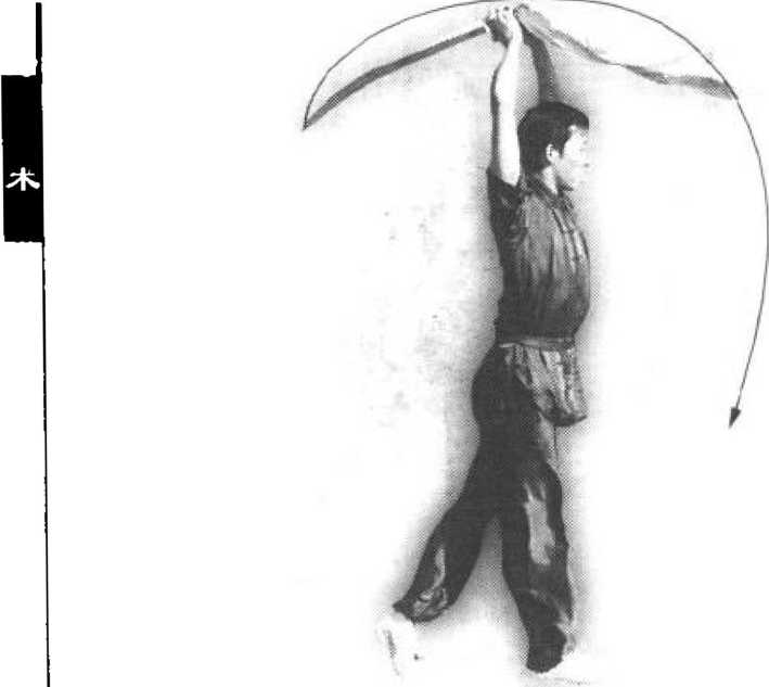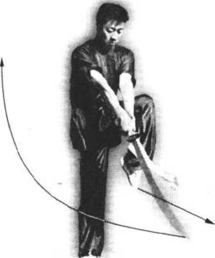 (4)上动不停,左腿直立支撑,右腿屈 膝上提。同时,双手握刀向下沿右腿外侧抡 劈。目视刀尖(图42-4)。