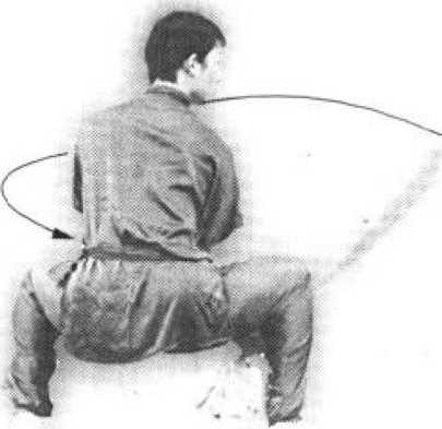 (6) 上动不停,身体左转90。,两腿屈 膝半蹲成马步。同时,双手持刀向右下方劈 刀至右膝内侧,刀尖斜向右上方,刀刃斜向 右下方。目视刀尖,发“咿”声(图42-6)。