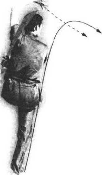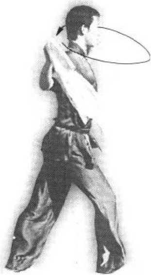 (1)接上势,重心上移,两腿自然站 立Q同时,右手握刀向左平扫经左臂外侧 向背后缠头绕行,刀背贴背,刀尖向下;在 掌向上置于右胸前,掌心向右(图43-1 )o