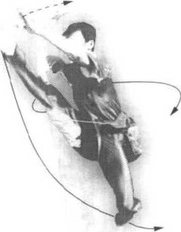 (3) 上动不停,右脚乘左腿提膝之势 蹬地跳起,身体腾空向夕'摆腿,向右转 180%空中藏刀不变,左手在面前面击右 脚面(图43-3 )o