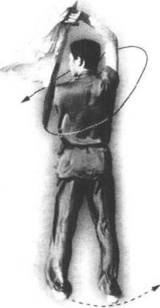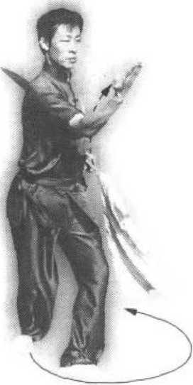 .(6)上动不停,身体继续向左拧转 180%目视右手(图44-6)。