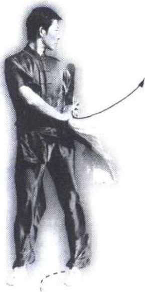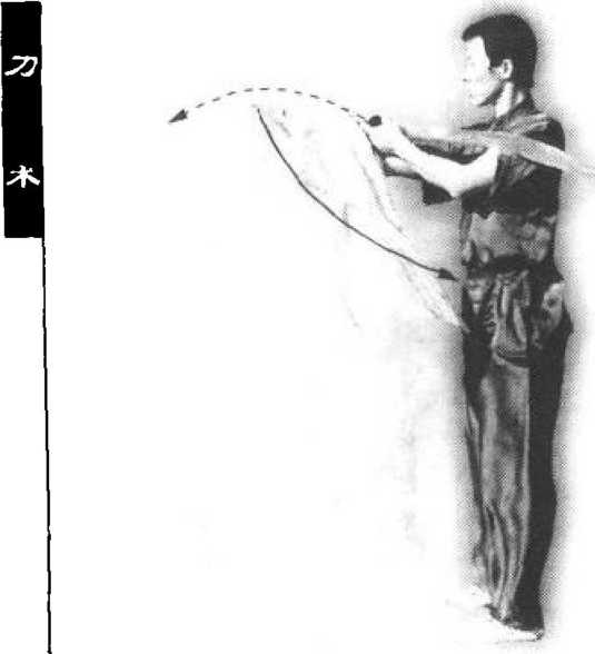 (2) 上励不停,身体左转90。。同时, 右手持刀向左平扫,经左臂外侧向背后缠头 绕行,刀背贴背,刀尖向下;左掌向前,屈 肘置于右胸前,掌心向石(图44-2 )。