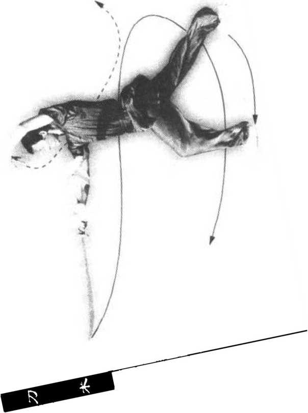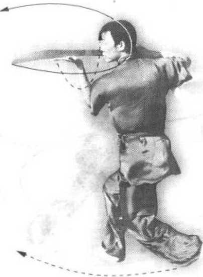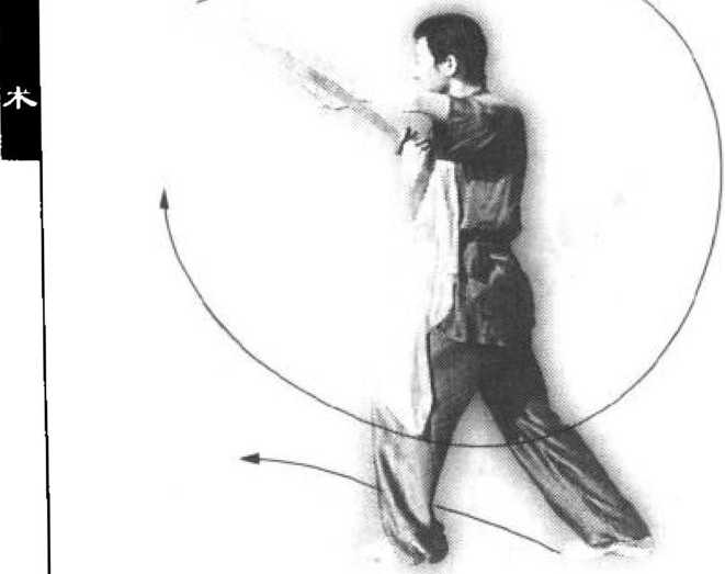 ;”(4)上动不停,上体向左拧转。左脚向 前上步,脚尖外展;右腿微屈。同时,右手 持刀,左手托刀背后段,石前臂外旋,使刀 向上沿右霄外侧向后、向下立圆一周撩至左 前上方,刀刃向上「刀尖向左前,刀与眼平 (囱 48 -4)。「