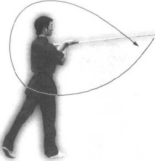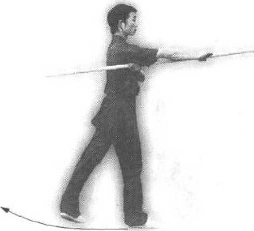 接上势,左腿微屈支撑,右脚圆前弹 出。同时,左手握棍,使棍梢向上挑出,高 与肩平;右手滑至棍把收于腰间。目视棍梢 (图 22)。