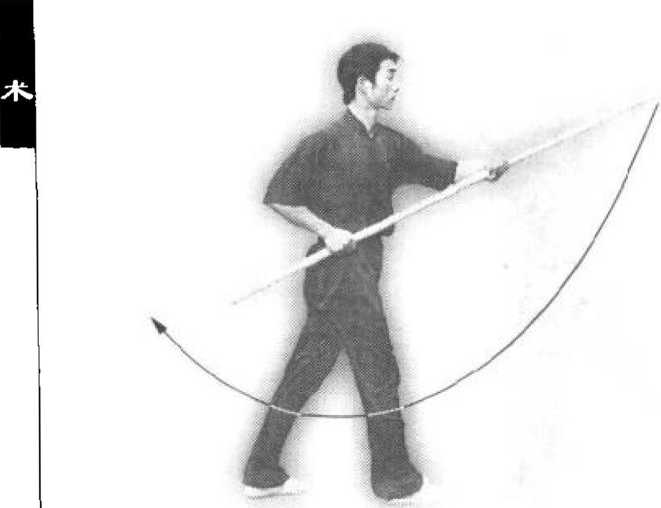 (2)上动不停,两手握相使棍梢在身体 石则向前、向下、向后、向上、向前立圆一 周,虎口相对向两恻滑握,右手握棍后段置 于右腰间,左手握棍前段置于胸前,棍梢向 前,高与腭平(图23-2)。