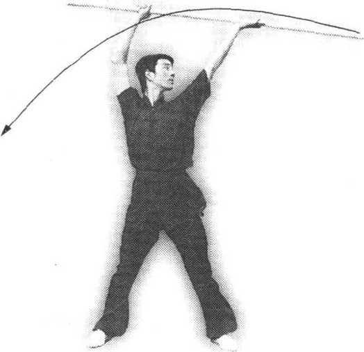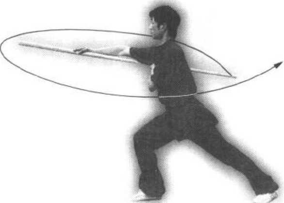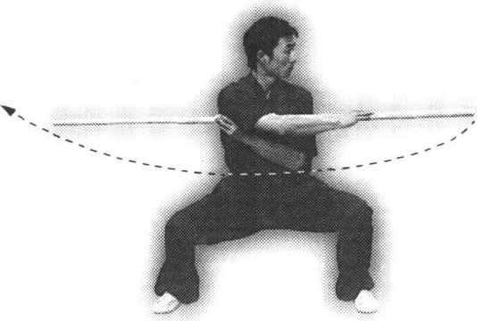 同时,两 手握棍使棍梢继续向下、向后运行,在手 持棍使棍身夹藏于右腋下,右手握棍直臂 贴棍,棍把向前,高与肩平。目视棍把 (图 23-3)。