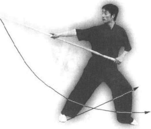 (4) 右腿 伸直支撑,左腿屈膝提起。同时,两手握棍 使棍梢随转体向上、向前、向左下方劈击, 棍贴于左臂下,棍梢斜向左下方。目视棍梢 (图 53-4)。要点:身体腾空不宜太高,动作协调, 勾踢清建,配合严密,斜劈拧腰发力°