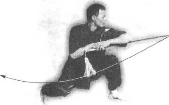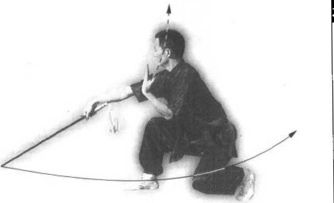 接上为,身体左转90。。左脚向左落步, 屈膝半蹲;右脚内扣,屈膝半跪,膝盖向 前,脚跟提起。同时,右手持剑内扣使剑尖 向左、向前运行至右胸前时,左手向下抱于 右手上,两肩发力,使剑尖向左前上方刺 击,高与肩平。目视剑尖(图26)。