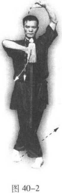 ::(2)上动不停,上体不变。右脚落实, 左脚尖点地成后点步。同时,右手持剑内旋 拾肘,使剑尖向上经面前下刺,手心向外, 剑尖向下,剑身垂直倒立距身体约10厘米; 左手剑指经面前上举置于头部上方,手心向 上,剑指向右。目视前方(图40-2 )o