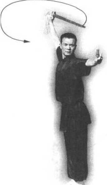 接上势,两腿伸直站立b同时,右手持 剑内旋经两膝前向右侧上方挑架置于头部上 方,手心向前,剑尖向左,手腕和剑身成 90。;左手剑指向左平推,手心向在,剑指 向上,高与肩瓦 日视左方(图46)。