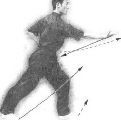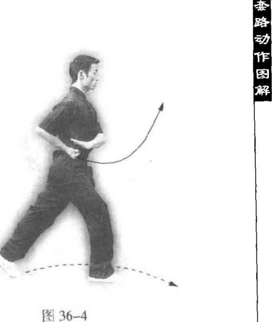 (4) 两脚不变。右臂屈肘叵 收经胸前向前下方旋臂冲拳,拳心向下,拳 眼向左;左掌随右臂运转贴于右肘关节处, 掌心向下。目视右拳(图36-3)。(4)上动不停,上体略右转,右脚向前 落步。同时"右拳抱于腰间;左掌附于石腕 上,掌心向下,掌指向右。目视前方(图 36-4)。.要点:上步和击肘要同时进行,整个 动作要连贯协调,完整一致。图 37-1