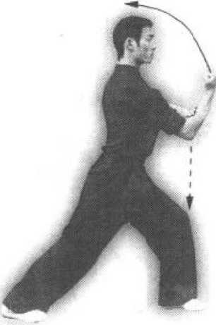 .(1)接上势,身体右转90。°同时,右 腿震脚;左腿屈膝提起,脚面扣于右膝后。 两拳胞于腰间不变。目视前方(图56T)。