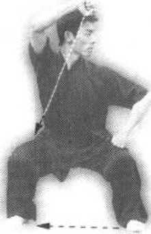 (3)上动不停,身体右转90。成马步。 同时,石拳内旋向上架手头部前上方约」5 匣米处,拳心向前,拳眼向下;左掌内旋变 拳下戳,拳面顶于左膝上广拳心向后。目视 左方,发“威”声(图562)。::