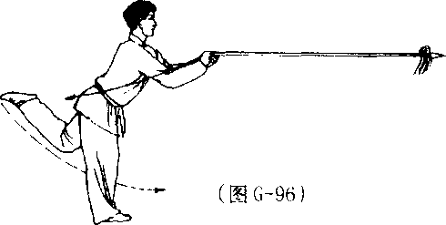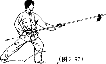 (1) 接上式,左脚向前落步, 身体左转90° ;右手握把回拉至 腰间,左手滑至枪身中节;枪尖高 与口平,目视枪尖。(图G-97)