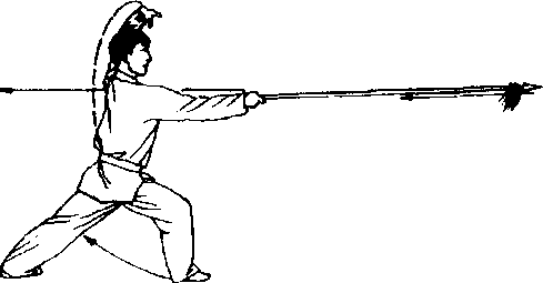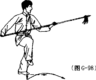 (3) 接上动,’身体左转90° , 右脚向前上步成右弓步;同时,右 手握把随右上步从腰间向前扎枪, 枪与肩平;左手脱枪变掌经胸前 上架于头前上方约15公分处;目 视枪尖。(图G-99)
