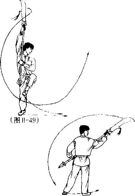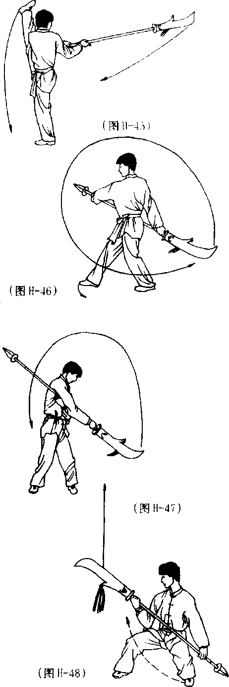 (3) 上动不停,继续使刀向上 经头前上方向下抱于右肩前,刀 刃向上;两腿微屈,身体重心移至 左腿。(图H-48)