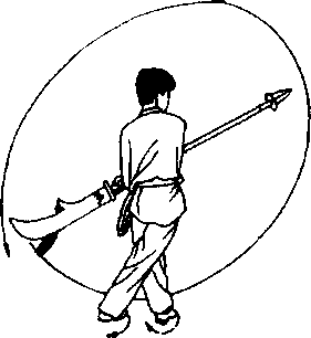 (2)右脚内扣,身体左转约 180° ;同时,两手持刀以刀背领 先由右后向上、向前、向下、向左 立圆划弧挂刀;目视刀背。(图H- 47)