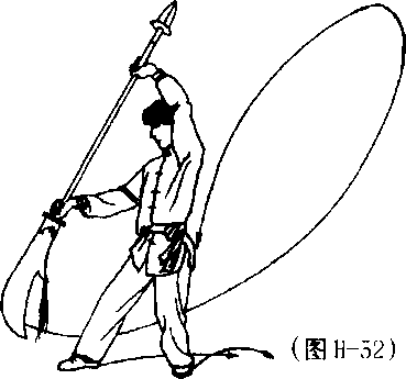 (图 H-30)(图 H-30)(图 H-51)(图 H-51)右腿立直成提膝平衡;同时,两手 持刀垂直上举,右前臂外旋,使刀 刃向左,刀柄紧贴右肋部;目视左 方。(图 H-49)