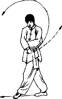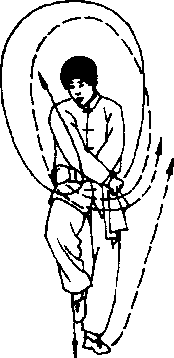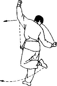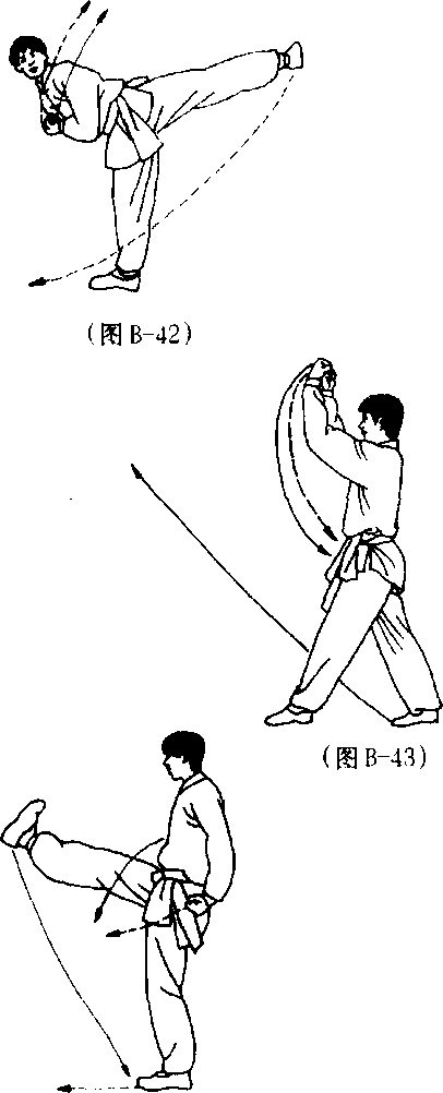 (2) 接上动,上体右倾,左脚 蹬地跳起,右脚落地直立;同时右 拳旋臂转腕由下向左、向上、向 右、向下以肩关节为轴,抡臂一 周;左拳由下向左、向上直臂划弧 抡起,并由上向右、向下抡压;右 拳由下在左臂内侧,经腹前,向右 穿出,拳心向后,拳眼斜向右下 方;左拳变掌摆动,由下向左置于 左脚上方,掌心向上,掌指向左; 目视左方。(图B-41)